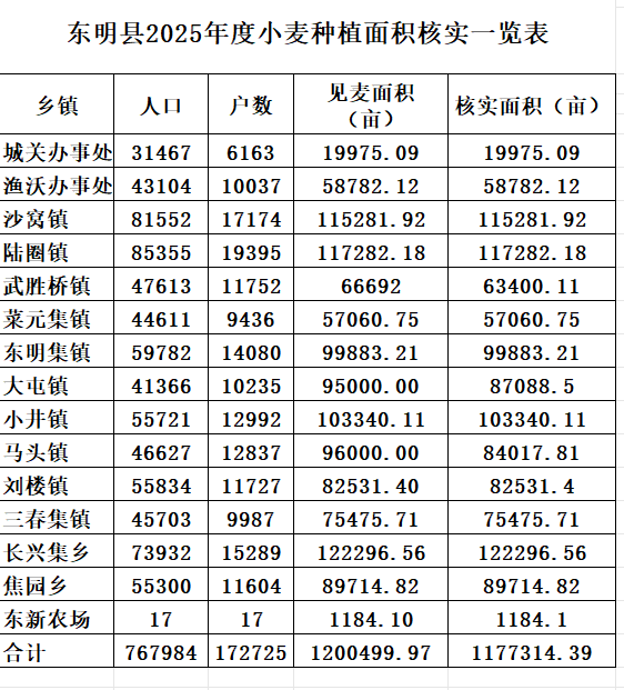 【結果信息】東明縣2025年度小麥種植面積核實一覽表